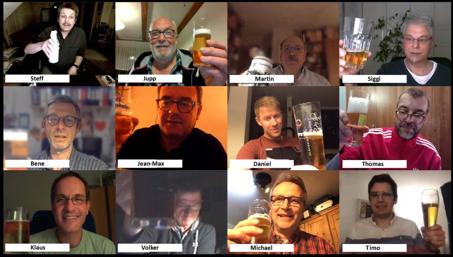 Das Treffen lief in diesem Jahr Pandemie-bedingt und Zoom-unterstützt rein online ab. Doch das war nicht die einzige Besonderheit. So hatten die beiden Moosköpp Klaus und Jean-Max im Vorfeld die phänomenale Idee, das Ganze mit einem „Bier-Tasting“ zu verknüpfen (ob das mit der Grund für die Vollzähligkeit der Herren war, ist nicht bekannt ... ). Dadurch hatte jeder an jenem Abend nicht nur einen PC-Bildschirm sondern zugleich auch 5 verschiedene, eingepackte Bierflaschen vor sich stehen, die durchnummeriert waren und deren Inhalt „erschmeckt “ werden musste. Die Bier-Tour ging, wie sich nach und nach durch das Leeren und Entkleiden der Flaschen herausstellte, von Tschechien über München, die Eifel und Köln bis hin zu der Stadt, in der das Bier so schmeckt, wie es heißt, nach Düsseldorf. Durch die Gespräche, die man während des Tastings führte und die zugegebenermaßen immer lustiger wurden, trat so die ein oder andere Anekdote zu Tage, die bisher noch kaum bekannt war; etwa die von Jupp zelebrierte Notwendigkeit, für häufiges Geschmacksneutralisieren zu sorgen, oder das erstaunlicherweise nahezu gleiche Alter von Timo und Daniel oder aber auch die ausgewogene Ernährung von Michael, dem es wichtig war, an jenem Abend auch feste Nahrung zu sich zu nehmen (Chips).