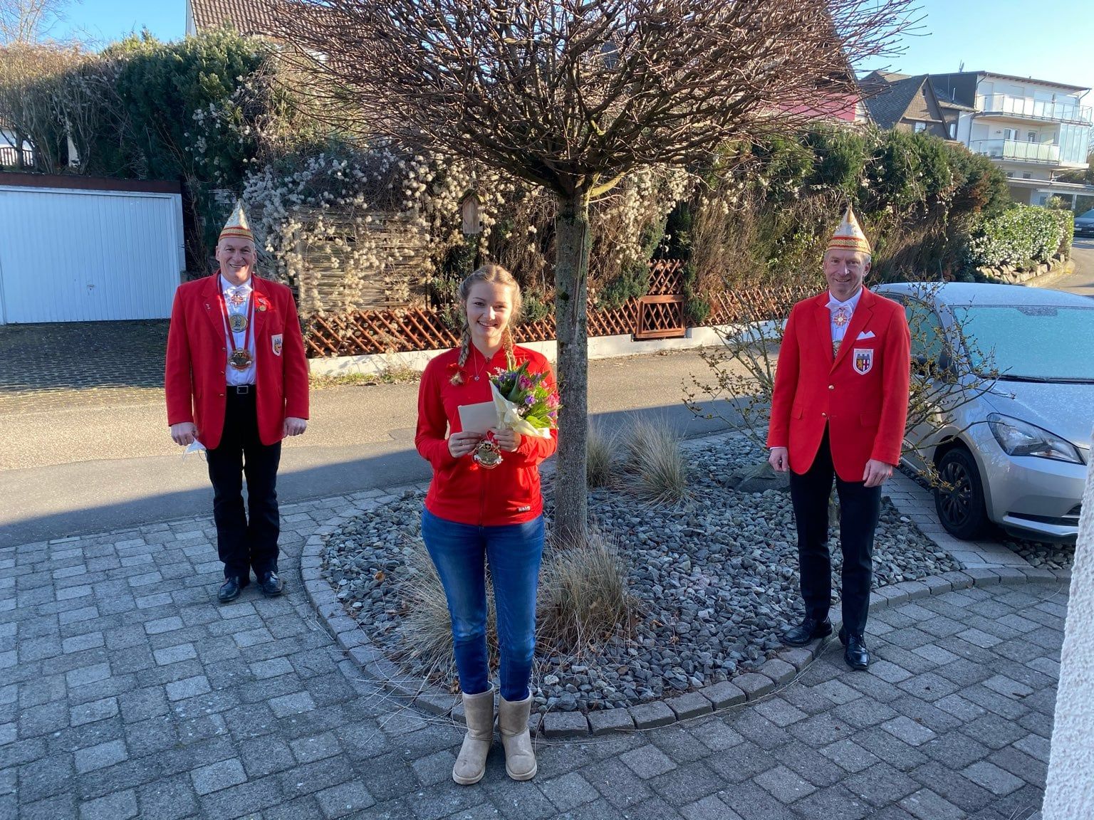 Nun galt es „Danke!“ zu sagen. Zum einen dem Mit-Initiator und Textgestalter Michael Wächter, zum anderen Matthias Ohlig, der - unterstützt von der Band „Die Roten Hosen“ sowie den Familien Ginap, Ohlig und Wächter – mit seiner Tonspur das klangliche Fundament für das Video erstellte. Schlussendlich ließen es sich Fred Pretz und Andreas Bomm (2. Vorsitzender der Bemoosten) nicht nehmen, der jungen Dame, die alles am PC bearbeitete und zusammenführte, persönlich zu danken. Auch wenn weder Händedruck noch Umarmung pandemie-bedingt stattfinden konnten, so nahm Lea Wächter doch sehr gerne Blumenstrauß und Essensgutschein in Empfang.