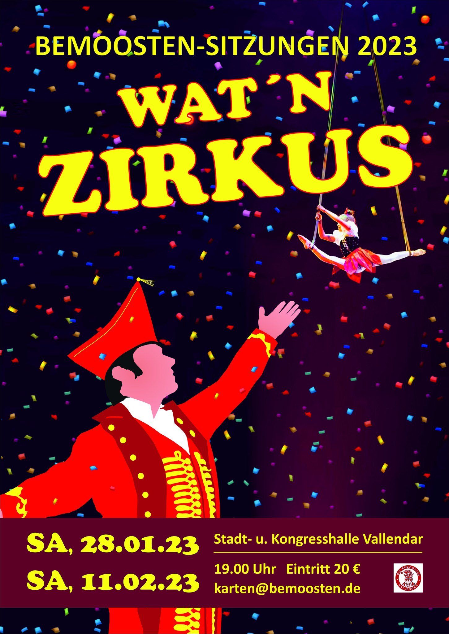 „Wat´n Zirkus!“ hatten die Bemoosten angekündigt und es war in der Tat eine ganz große Zirkusshow, die die Aktiven am vergangenen Samstag in der Vallendarer Stadt- und Kongresshalle präsentierten. Sitzungspräsident Horst Wächter gab vor ausverkauftem Haus pünktlich die „Manege frei!“, denn mehr als 60 Aktive standen bereit, gemeinsam mit dem Publikum diesen Höhepunkt des Bemoosten-Jahres zu feiern. Trotz ihres „hohen Alters“ von mehr als 180 Jahren hatten die Vallerer Karnevalisten voller Tatendrang ein buntes, närrisches Programm zusammengestellt, das einen weiten Bogen von gesprochenem Wort über tänzerische Höchstleistungen bis hin zu gesanglichen Darbietungen spannte. Der Dank für diesen gelungenen und begeisternden Sitzungsabend gilt allen Aktiven, der bestens aufgelegten Sitzungsband „Die Roten Hosen“, dem Vallerer Dreigestirn nebst Gefolge, aber natürlich auch einem phantastischen Publikum, mit dem es einfach Spaß gemacht hat echte Vallerer Faasenacht zu feiern!