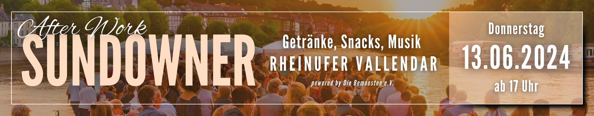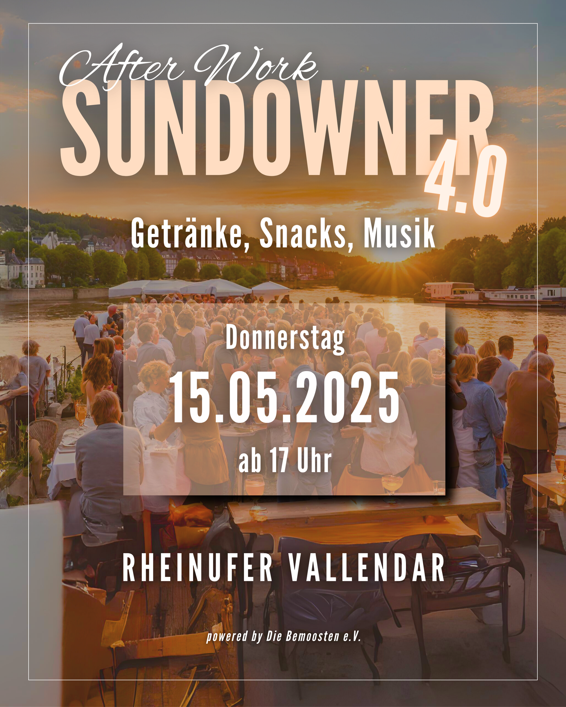 Ein weiteres wichtiges Thema des Abends war die „Sundowner"-Reihe am Rheinufer. Der überraschend große und immer noch wachsende Zuspruch, den diese Veranstaltung genießt, ist so erfreulich wie herausfordernd. Aber keine Bange: am Donnerstag, 26. Juni, folgt der Sundowner 5.0, denn: Bemoosten - weil's einfach Spaß macht!