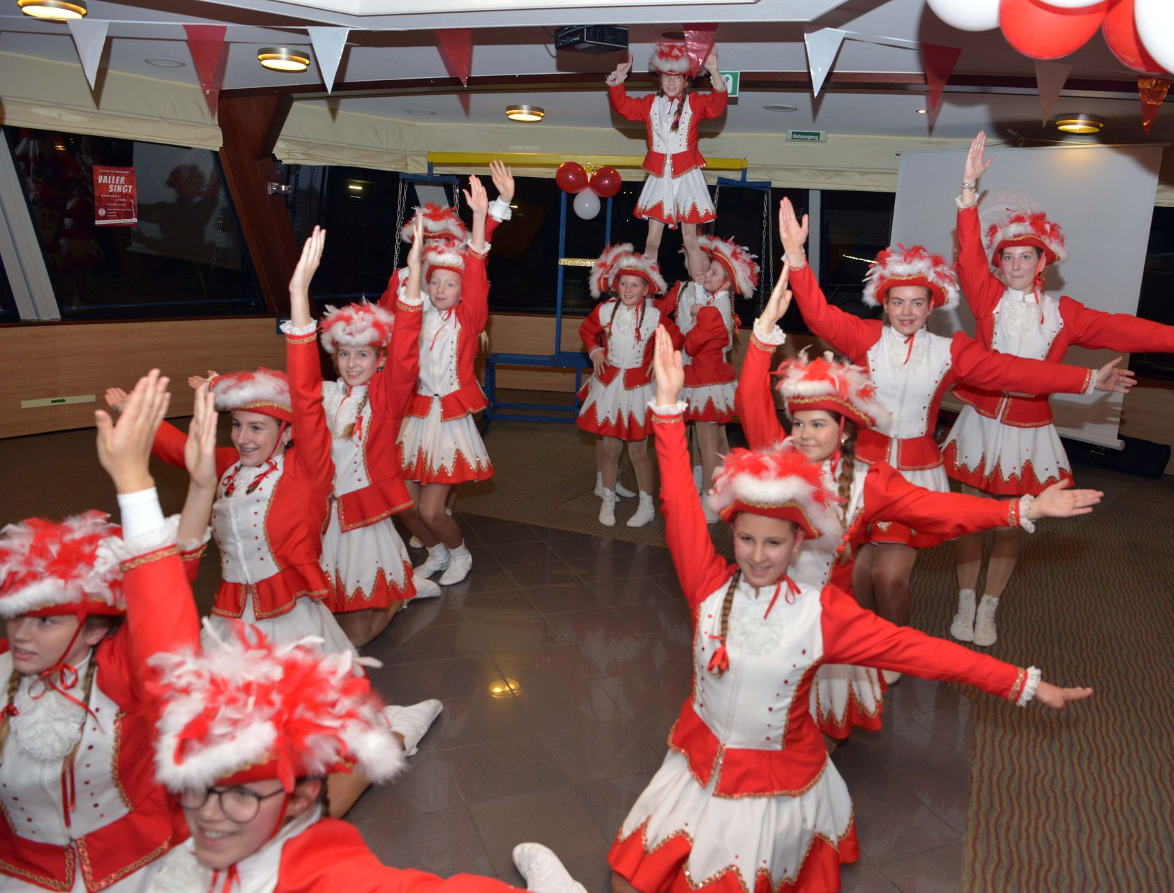 Den ersten Programmhöhepunkt setzte die mittlere Garde der Bemoosten, die mit einem schwungvollen Tanz das Publikum in Stimmung brachte. Kurz darauf sorgte das Kinderprinzenpaar der Fidelen Frauen mit Prinz Tobias I. und Prinzessin Emma I. für einen glänzenden Auftritt und richtete herzliche Grüße an das närrische Publikum. Ein kleiner Vorgeschmack auf die Veranstaltung „Valler Singt“ am 10.01.2026, sowie eine spannende Verlosung rundeten das Programm ab. Auch das traditionelle Wiegen des Schützenkönigs durfte nicht fehlen und sorgte erneut für heitere Stimmung.