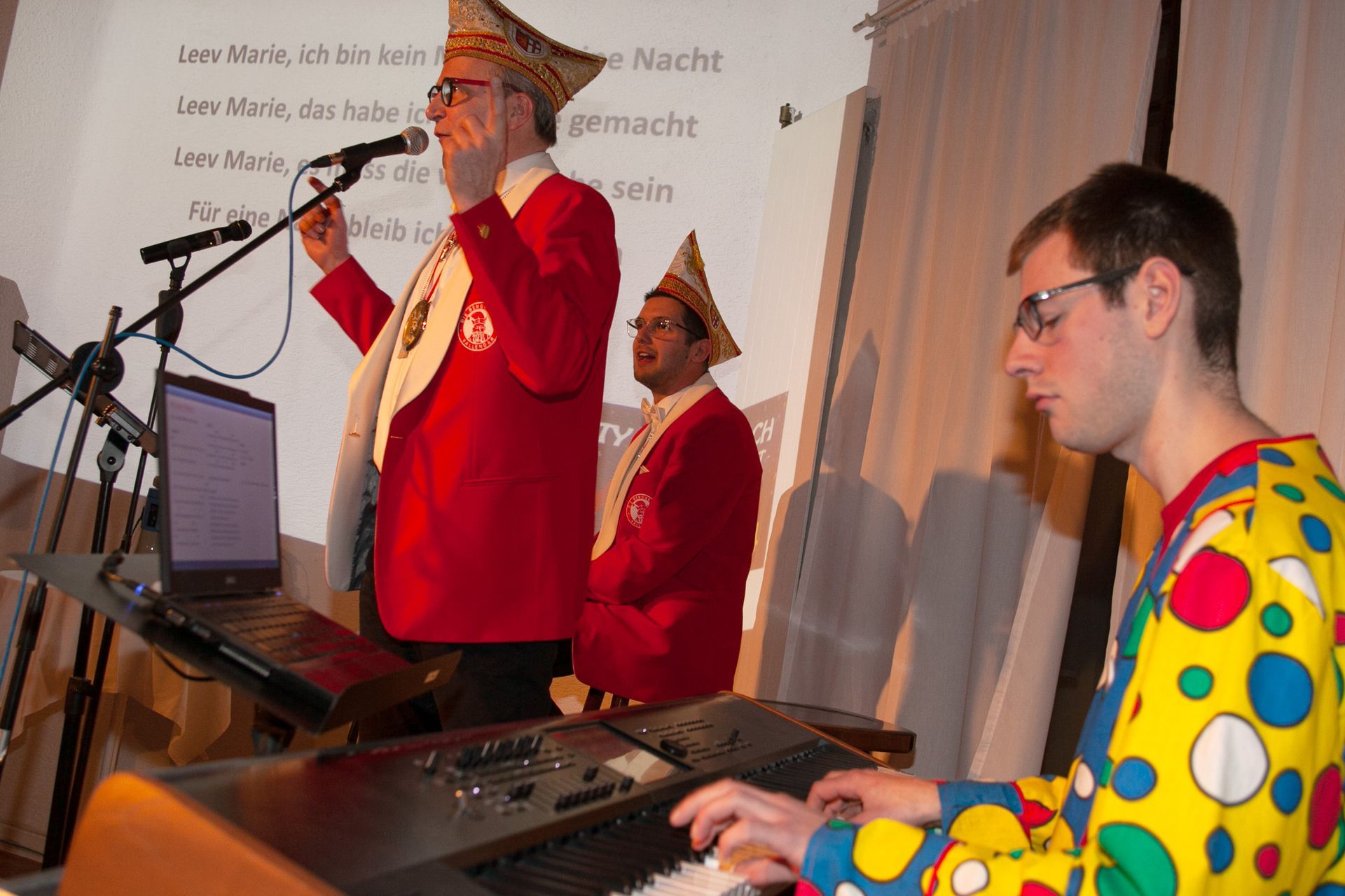 Die Bemoosten hatten zu einem stimmungsvollen Abend eingeladen, der gleich 3 Knalleffekte zu bieten hatte: „Valler singt“, DJ Marvin und die Cocktail-Station „Gassen-Bar“! Menschen jeden Alters - ob Frau, ob Mann, ob Sänger oder Nichtsänger, ob Normalsterblicher oder eingefleischter Faasenachter - nutzten zu Beginn der Veranstaltung die Gelegenheit, karnevalistische Hits und Gassenhauer in lockerer Atmosphäre zu singen. Nach dem einleitenden "Mir loose de Roodes in Valler" begrüßte Sitzungspräsident Horst Wächter die zahlreich erschienenen Gäste. Doch viel Worte wollte und musste er gar nicht finden, denn alle warteten nur darauf, loszulegen und "Ruud sin de Ruse", "Et jitt kein Wood" und "Hey Valler" anzustimmen. Bemoosten-Techniker Lutz Haushahn projizierte die Texte per Beamer an die Wand, alle sangen einfach lautstark mit. Für die musikalische Unterstützung hatten die Bemoosten aus eigenen Reihen einen absoluten Musik-Fachmann organisiert, der zusammen mit den Roten Hosen seit Jahren die Sitzungen begleitet: Matthias Ohlig legte mit seinem Piano das musikalische Fundament. Ihm zur Seite standen Timo Krämer und Michael Wächter, die das vollbesetzte Haus gesanglich auf die richtige Bahn brachten; doch viel zu tun hatten die beiden nicht, denn meist waren es die Besucher, die das Heft in die Hand nahmen und dabei lautstark eine Menge Spaß hatten!